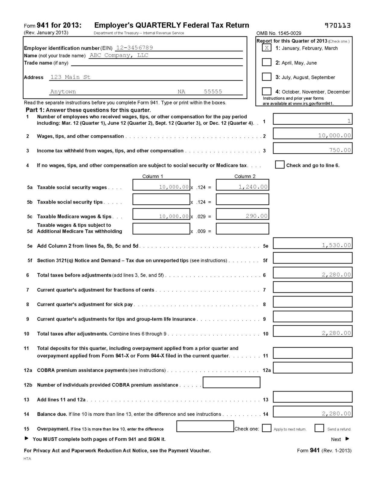 I’ve included an image below that shows you what a completed 941 looks like when you’re paying a shareholder-employee $10,000 a quarter and withholding $750 a quarter in federal income taxes. You of course enter the employer identification number, name and address information with your actual information.