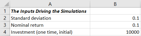 What these values do, by the way, is set you up to simulate how your portfolio performs if you average a 10% nominal return, experience a 10% annual standard deviation, and start with $10,000.