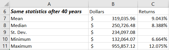 At this stage, your stock market Monte Carlo simulation spreadsheet works. And every time you recalculate the spreadsheet, you will get a new set of statistics.