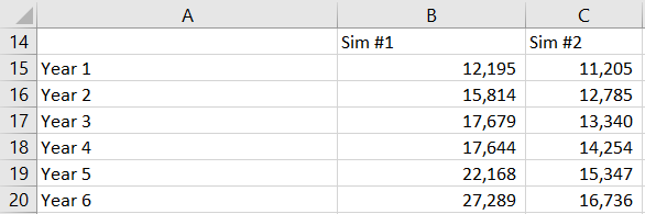 To build the simulated ending values table—this is where the actual Monte Carlo simulation calculations occur—first use the range A15:A54 to label the years. Then use the range B14:K14 to label the simulations. (The figure below shows a fragment of this part of the spreadsheet.)