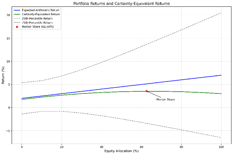 A simple line chart accurately shows how Merton shares and certainty-equivalent returns work (see below).