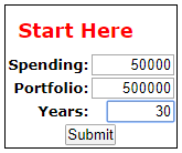 The main FireCalc web page provides text boxes (shown below) into which you enter your planned retirement spending, your current retirement savings, and then your remaining life expectancy. To double-check the math described earlier, for example, set the Spending to $50,000, the Portfolio to $500,000 and then the Years to 30, the planned years of retirement.