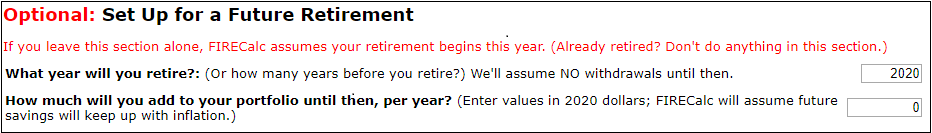 If you are still working and saving, click the Not Retired tab at the top of the FireCalc web page. Then enter the year you will retire into the What Year Will You Retire? text box and the additional annual amount you will save into the How Much Will You Add To Your Portfolio Until Then, Per Year? text box. The screen fragment below shows an example of this: