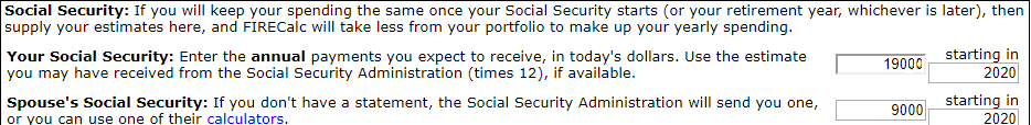 The worksheet fragment below shows a married couple planning to both retire in 2020 with one spouse receiving $19,000 in benefits and the other spouse receiving $9,000. And note: At this point, you’re entering the Social Security benefits you would receive if you don’t delay starting Social Security.