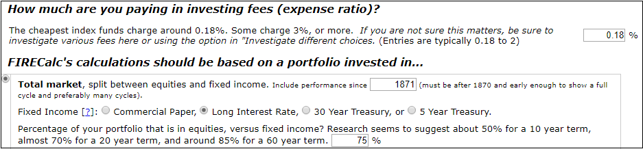 You can use the default FireCalc investment portfolio description for your calculations: 75 percent in stocks, 25 percent in long-term U.S. Treasuries, and a .18% expense ratio. But if you want to tweak the description so it better matches your own portfolio, click the Your Portfolio tab. Indicate your annual expense ratio using the How Much Are You Paying In Investing Fees text box. Indicate what percentage of your portfolio you’ve invested into stocks using the Percentage Of Your Portfolio That Is In Equities, Versus Fixed Income box.