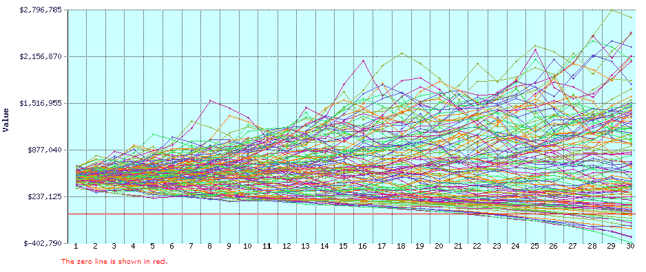 After you complete step 4 or step 5–whichever is your last step—click the small button labeled “Submit” at the bottom of the web page. FireCalc calculates the historical results for each of the possible scenarios it can test. It then displays a very busy line chart (see below) that plots out the retirement nest egg balances over retirement for each scenario. And it calculates the success rate, worst-case, median-case, and best-case investment balances.
