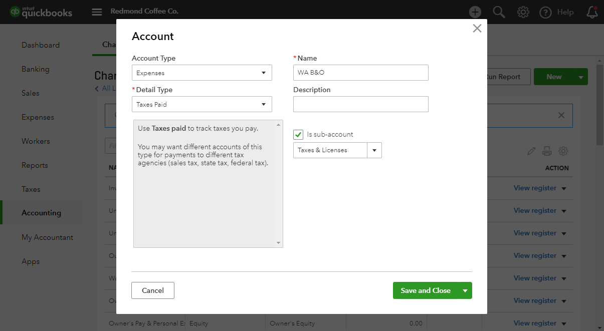 All right, that’s sales tax set up. But for Washington State businesses, there’s one final step you’ll need to take to get things really working right for recording payments, and that’s creating an account in the chart of accounts for Washington B&O (see below).
