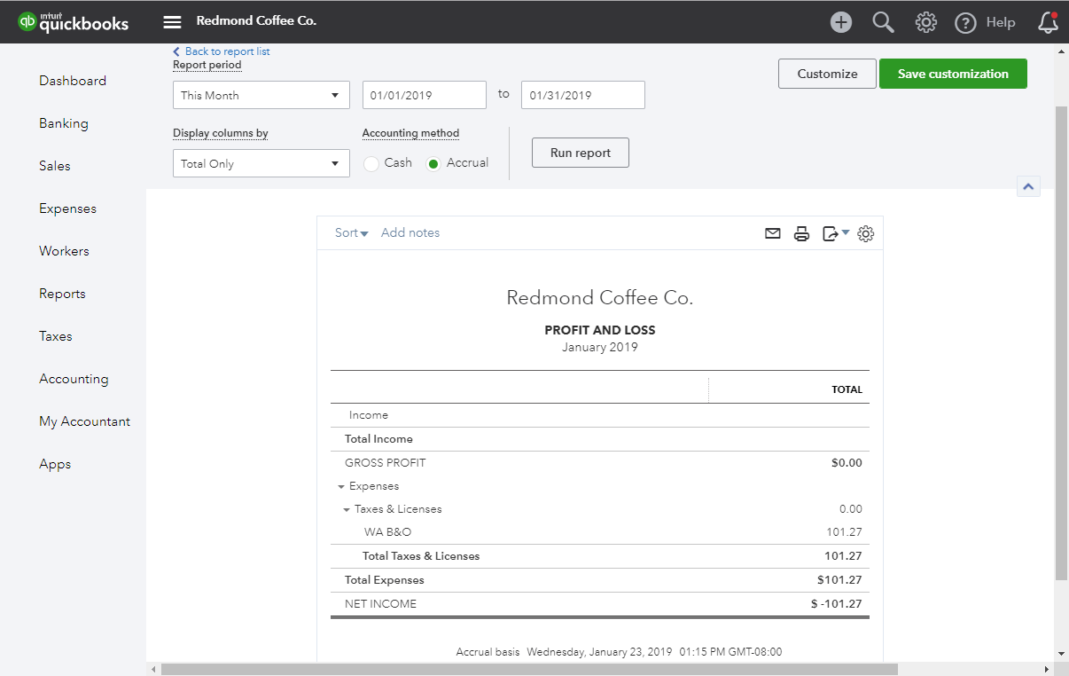 The one major drawback to be aware of is that, using this method, Washington B&O expense will only show up as an expense as of the date the expense was paid, regardless of whether or not you’re generating reports on cash or accrual basis. In other words, you won’t be able to track B&O accrual’s properly with this method (as shown below).
