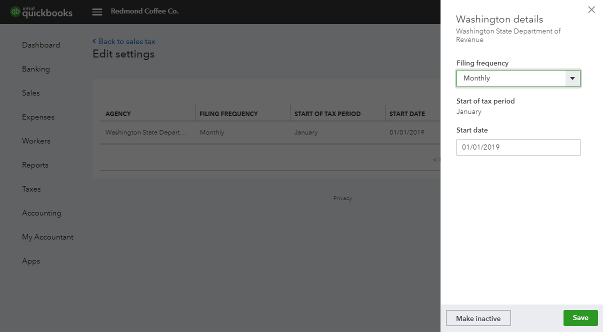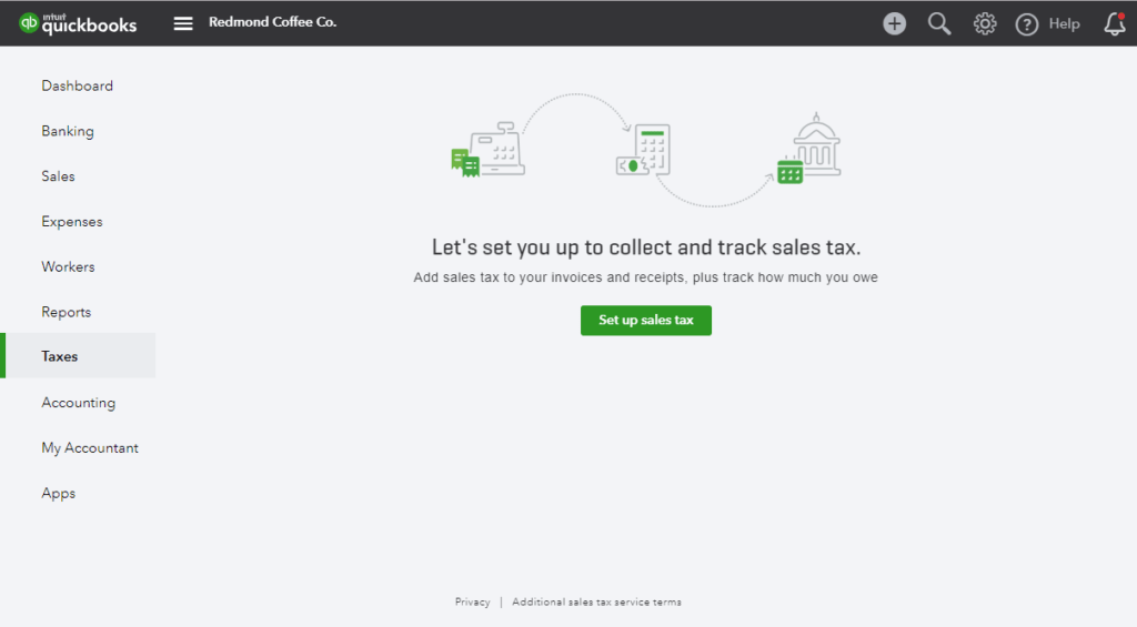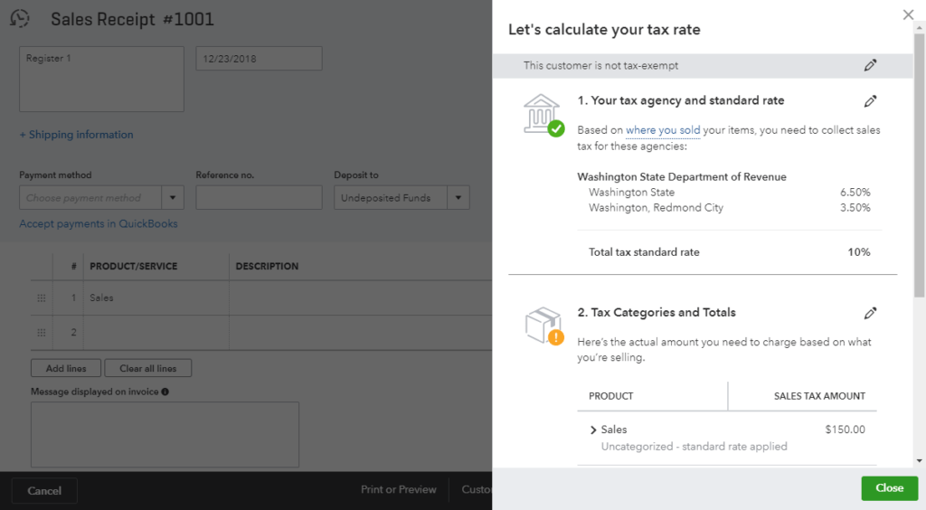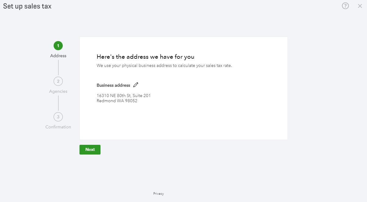 The address you use for this step is important, because it tells QuickBooks what taxing jurisdiction you’re in. For example, our hypothetical coffee shop is located in Redmond, WA. That means that, as of this writing (and for the purposes of this example), its sales are subject to a state sales tax rate of 6.5% and a local sales tax rate of 3.5%.
