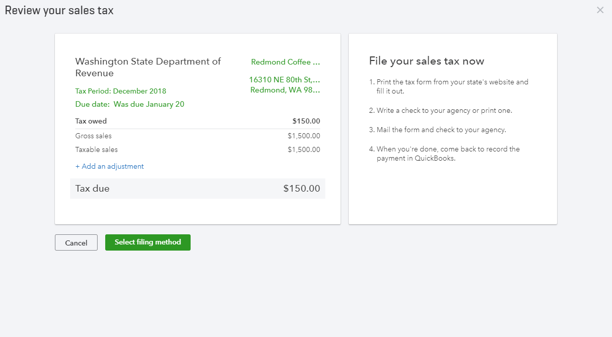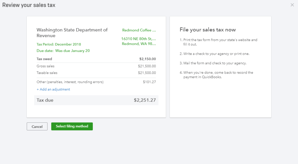 Once you’ve added the adjustment, the amount QuickBooks indicates for Tax Due should be the same as the amount you actually paid with your Washington Excise tax return when you filed it using MyDOR. (We have more information on MyDOR accounts in this article on our blog.) If the amount looks correct, click the green “Select filing method” button.
