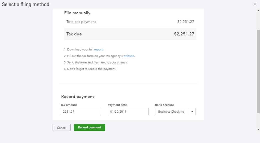 As of this writing, QBO’s automatic sales tax doesn’t support e-filing for WA sales tax (and if they did, this workaround probably wouldn’t be necessary). So, choose “File manually” as your filing method. Then, be sure to scroll down far enough so you can see where to enter information about when you paid sales tax. Enter the date paid and which bank account you paid it out of, then click “Record Payment.”