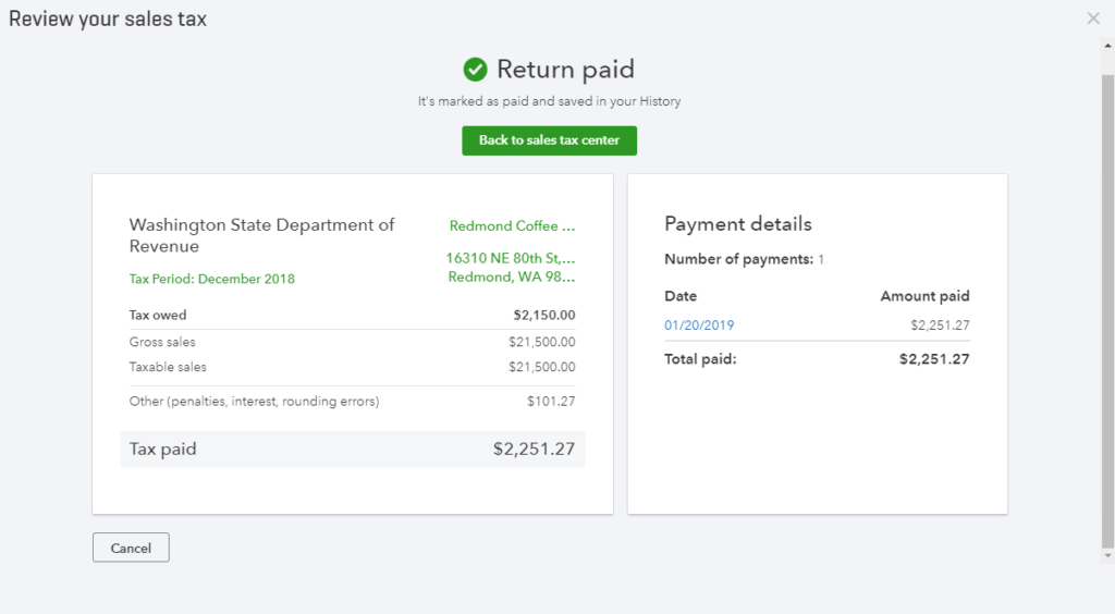 This is the last screen you’ll see, and it just confirms you recorded the sales tax as paid in QuickBooks.