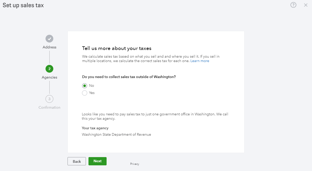 Perhaps obviously, click the green “Set up sales tax” button. The next few screens you’ll see will look something like this: