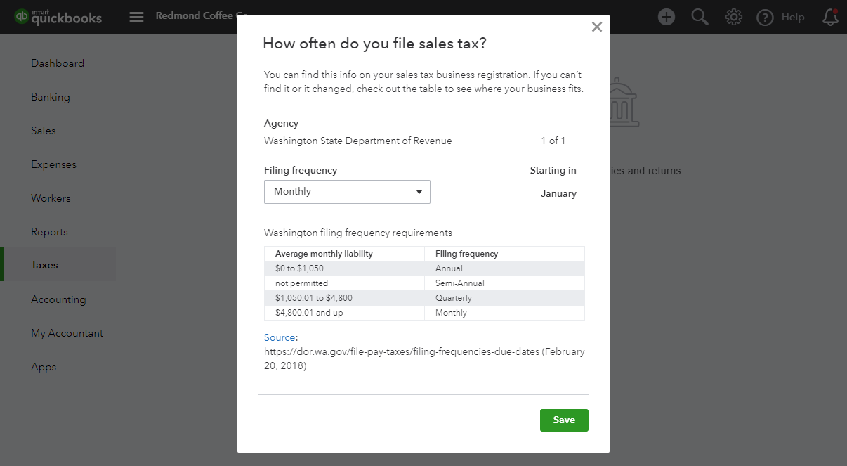 After this initial setup, QuickBooks will ask you how frequently you file sales tax in Washington State (see below). Your business’ filing frequency is based on your estimated sales tax liability. In our example, the combined state and local sales tax rate is about 10%. So, a business with about 48,000 or more in monthly taxable sales would need to file monthly, whereas a business with smaller sales volume might be able to file quarterly or even annually.