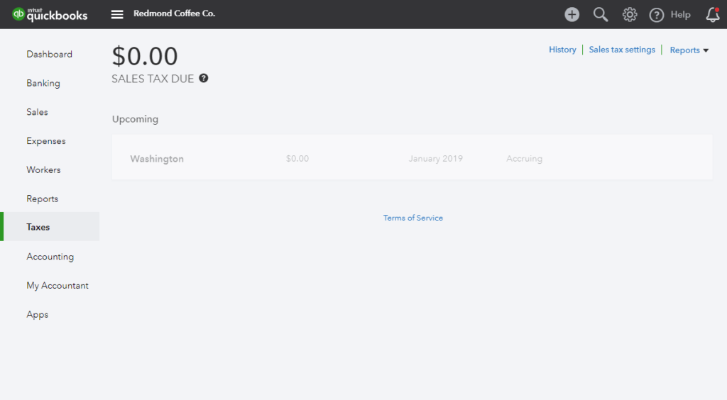 First, navigate to Taxes in the left navigation menu (between Reports and Accounting). You’ll see this screen, or something close to it: